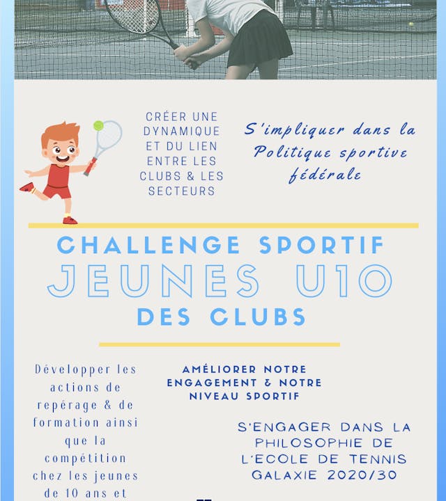 - Développer : Des actions de repérage, des actions d’entraînement et la compétition U10 (Tennis Matchs / Galaxie / Match libre / IC)